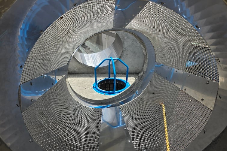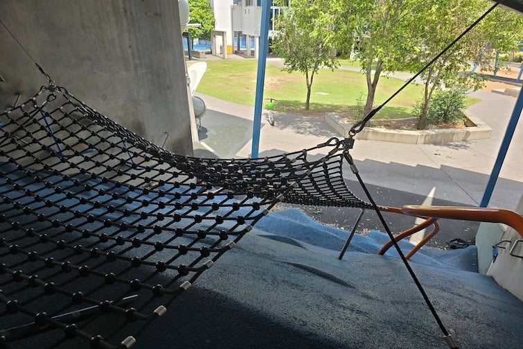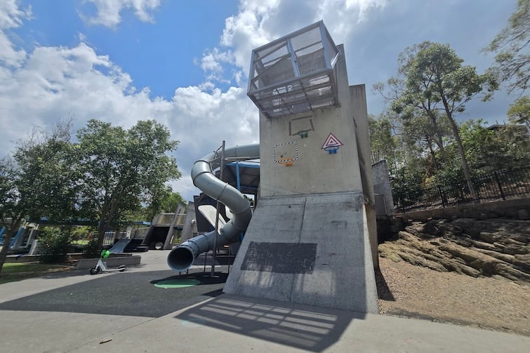 The cement play structure has huge slides, ledges for climbing and parkour, a curling slide that’s five metres high and an enclosed mesh cage that dangles eight metres off the ground! It can be challenging for the younger kids but there are opportunities to scale down the challenges in the way they choose to climb or navigate the play space.