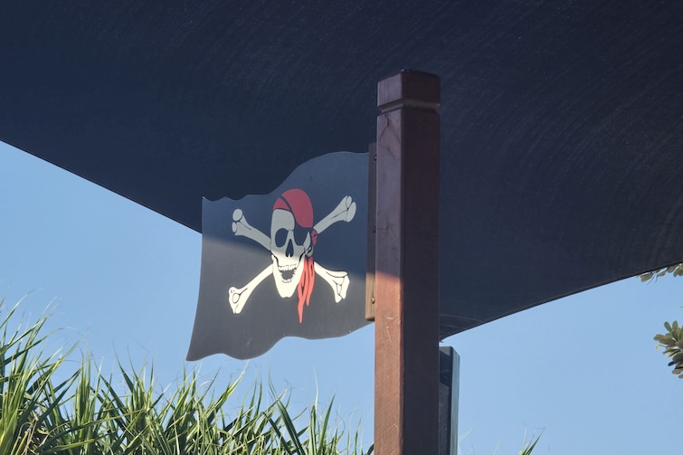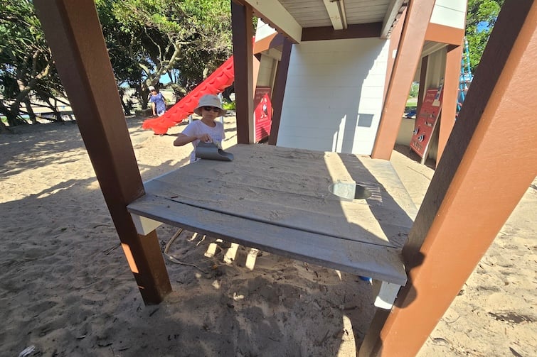 The other captivating play structure is the wooden pirate ship, which appears sunken into the sand, making it the perfect location for little and big kids to play in. Steer the pirate ship to safety or slip down the pole or slide to search for treasure in the sand below.
