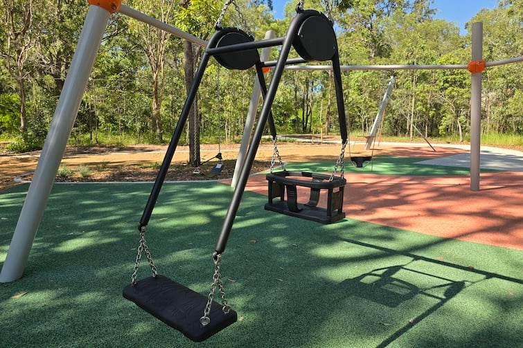 Separate to the play tower you will find an accessible carousel, five-way swings (standard, toddler, high back and face-to-face swings), stepping and balancing logs, as well as a zippy flying fox.