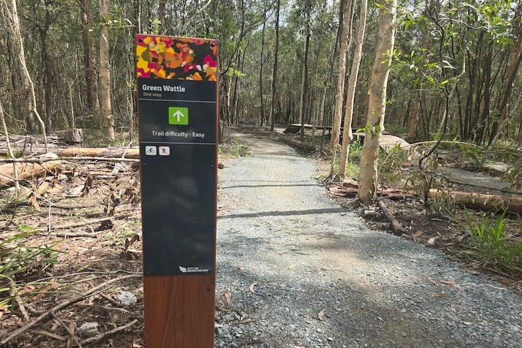 The one-way trail starts off easy (Trail 1 โ Green Wattle), with a gentle climb meandering through the trees before arriving at Trail 2 โ Froglet, which is also listed as โeasy.โ This trail then splits into two: Trail 3 โ Blue Gum to the right and Trail 4 – Fantail to the left. Both Trail 3, 4 and 5 are listed as Intermediate.
